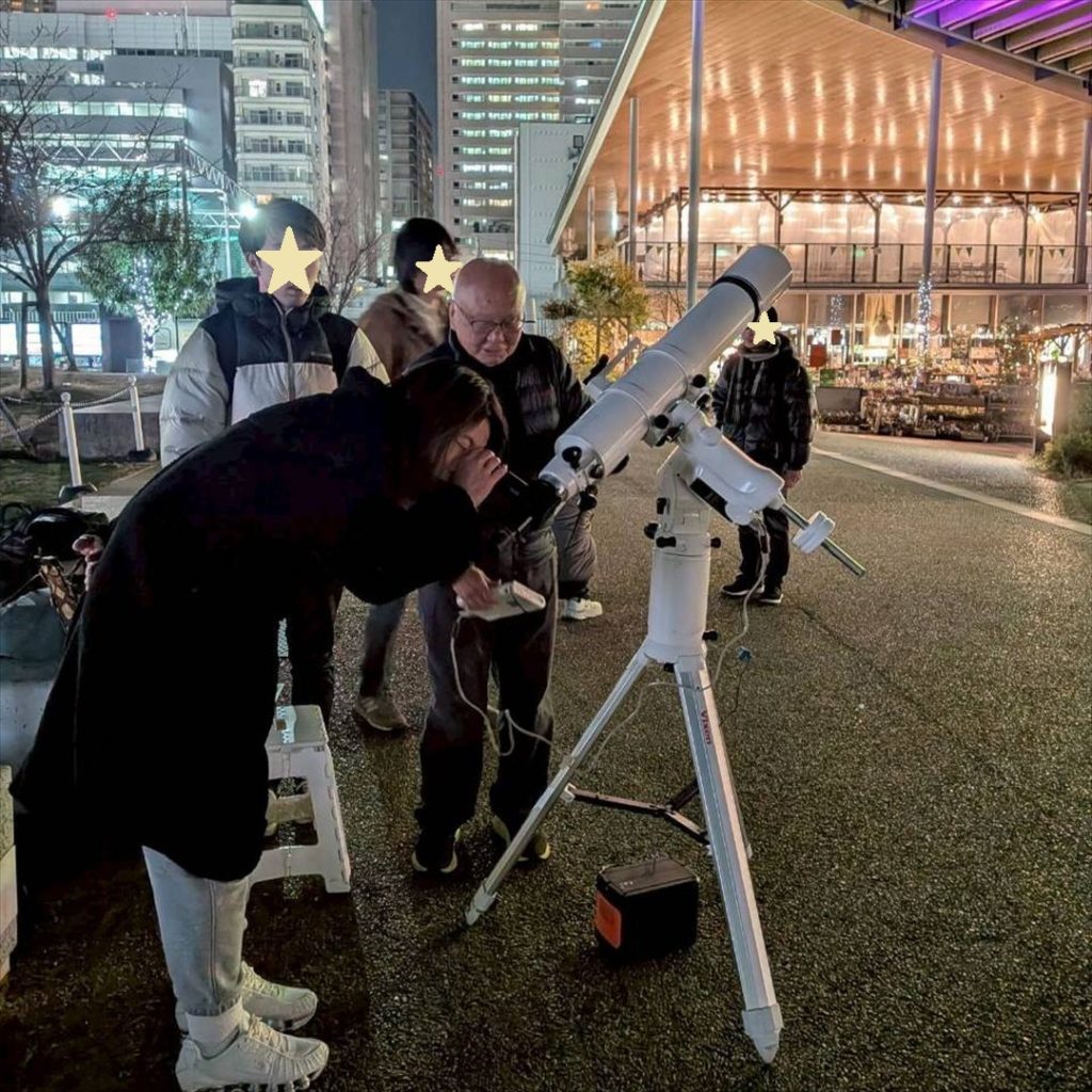 大阪天王寺公園エントランスエリア(てんしば)において天体観察会を開きました。厳寒の中での開催となりましたが、お越しいただいた方々には天体望遠鏡で月や木星、土星などを見て楽しんでいただきました。また、月のスマホ撮影にも挑戦していただきました。
