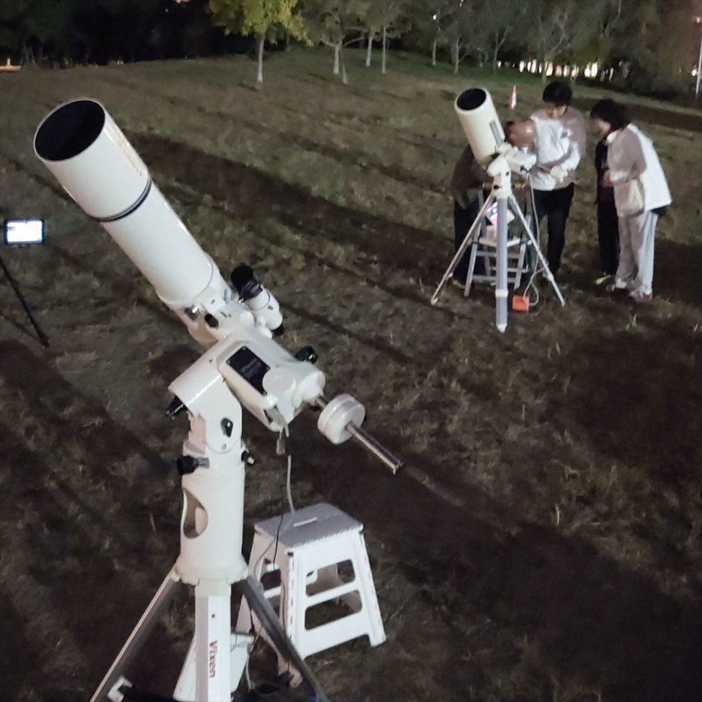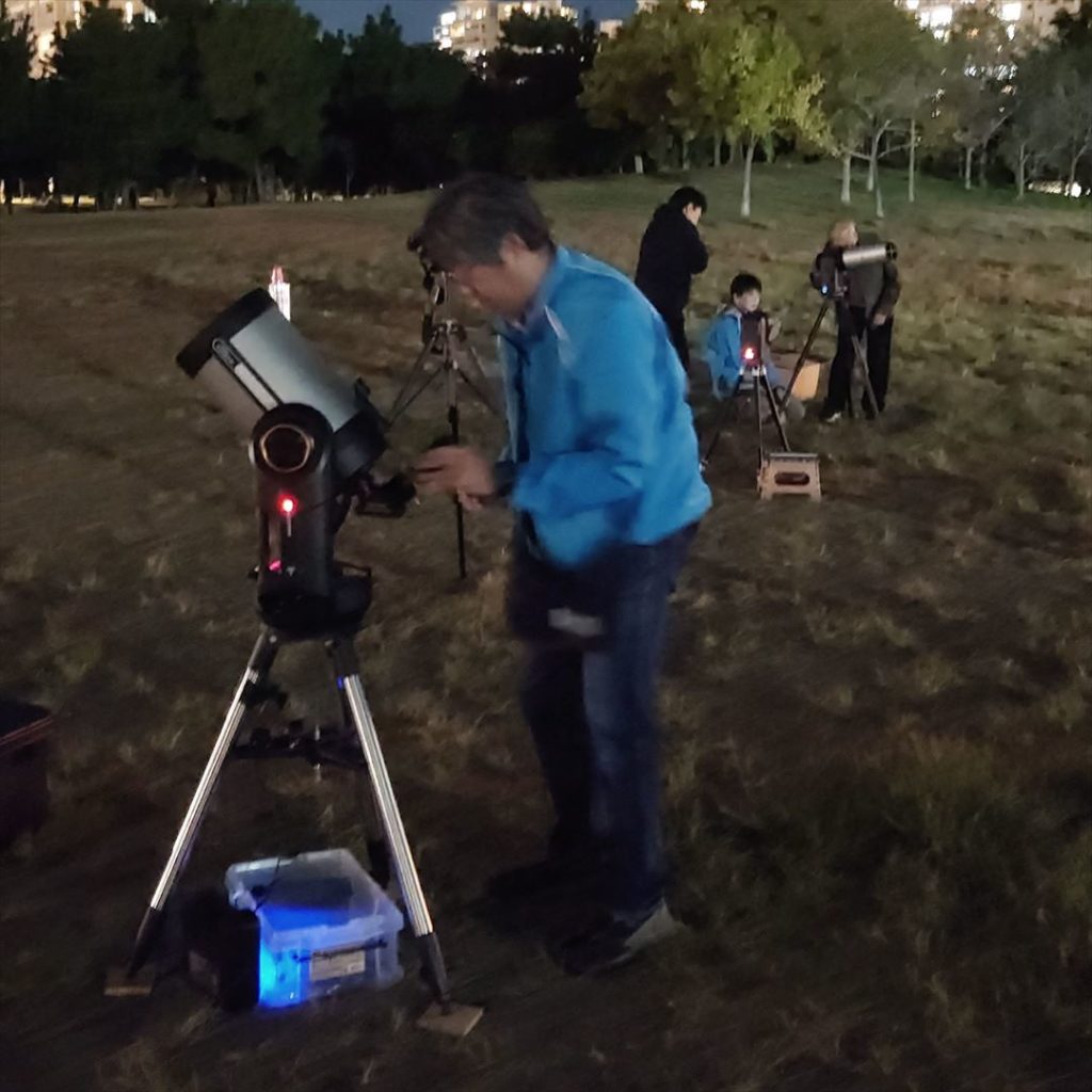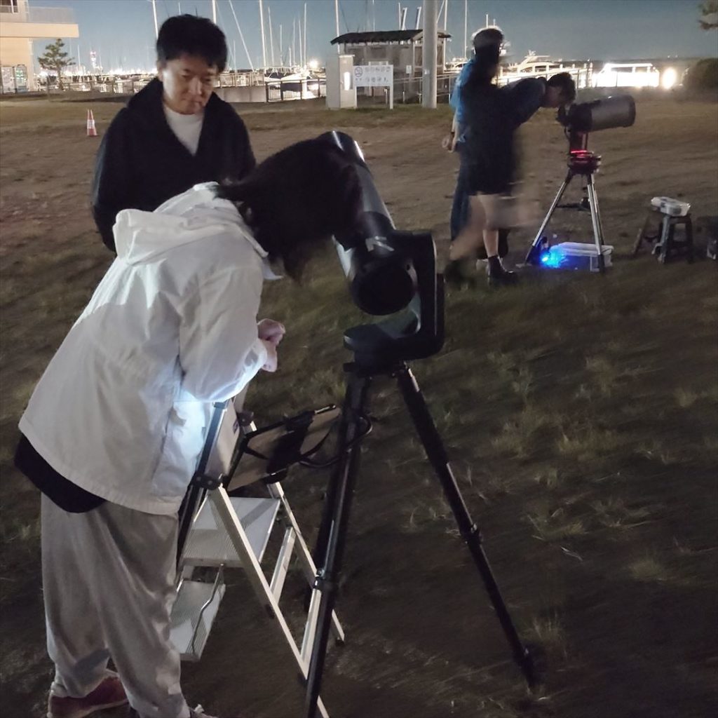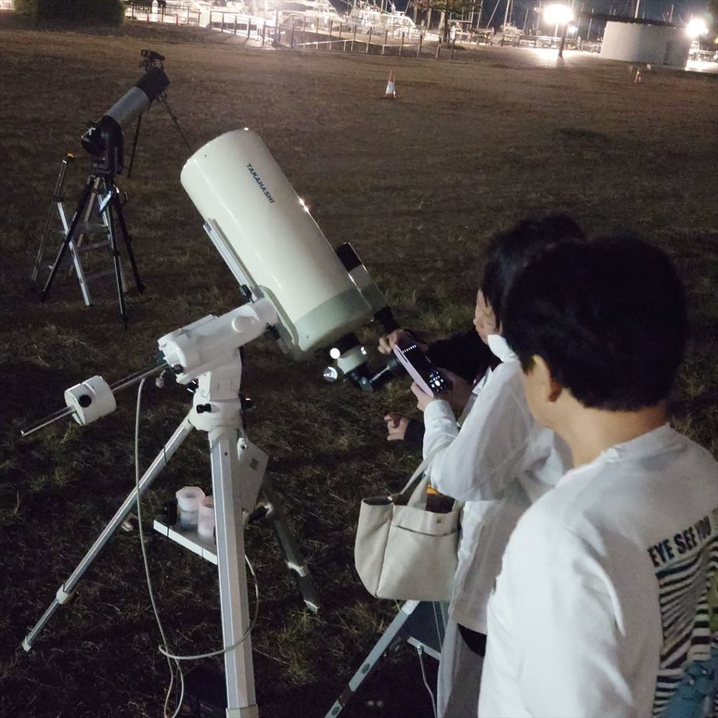 新西宮ヨットハーバー西横の広場において、星空観察会を開きました。久しぶりの快晴で、きれいな星空が広がっていました。お立ち寄りいただいた皆さんには、天体望遠鏡で月や土星、木星やアルビレオなど、双眼鏡でプレアデス星団(すばる)、電子望遠鏡で球状星団のM13、惑星状星雲のM27・M57、渦巻銀河のM31・M33・NCG253などを見て楽しんでいただきました。また、月やM57・NGC253ではスマホでの写真撮影にも挑戦していただきました。
