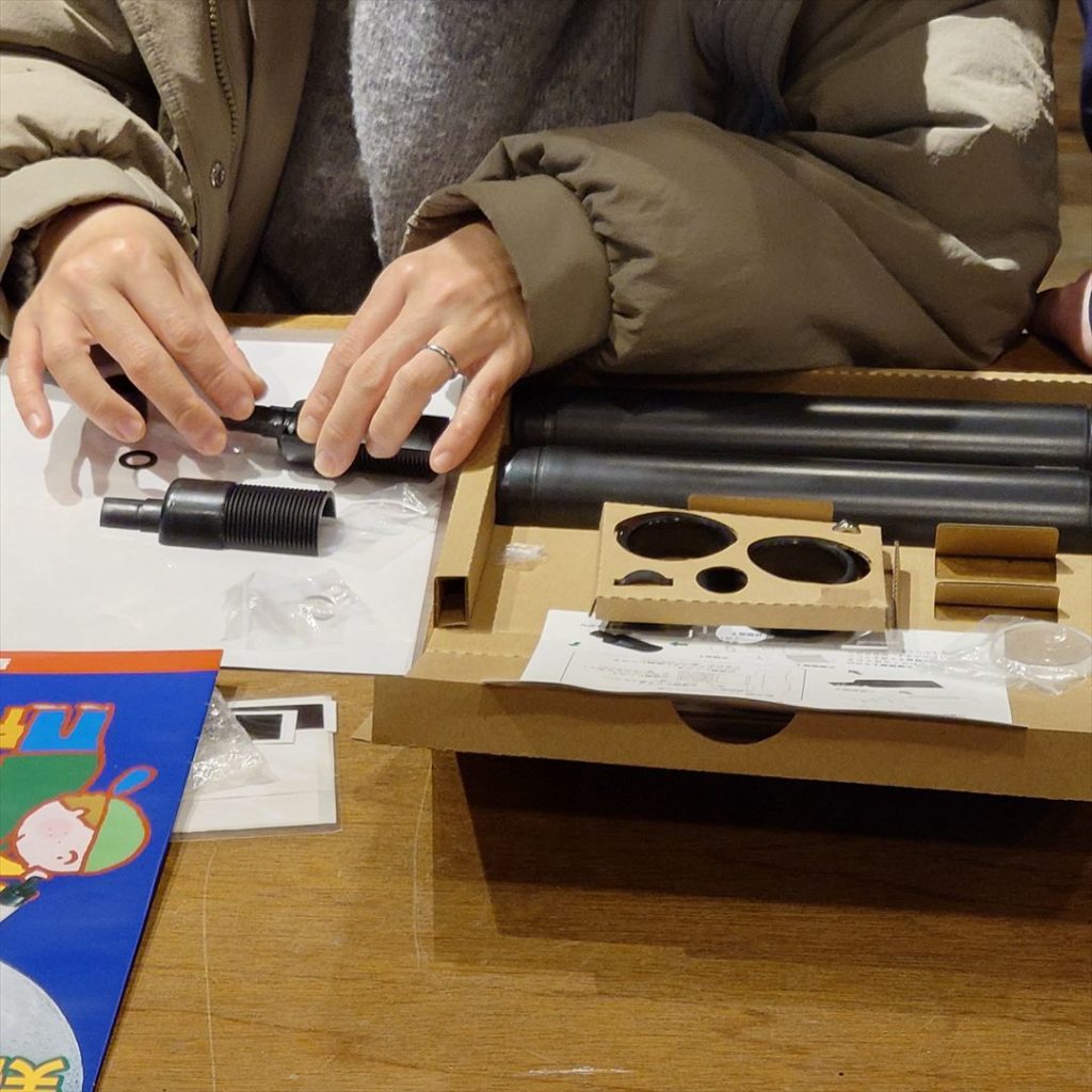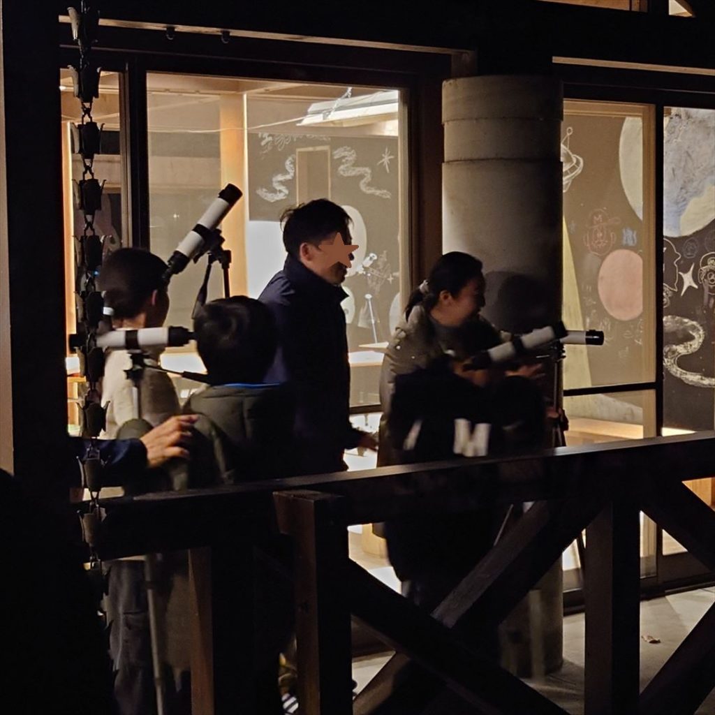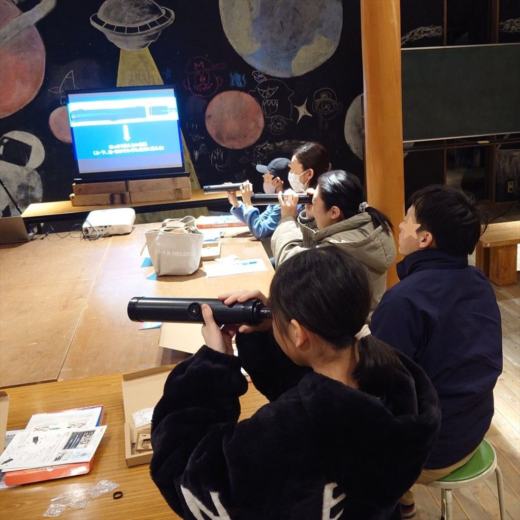 星の里いわふねにおいて、ワークショップ ”望遠鏡を作って月を見よう” が開催されました。プラネタリウムで見頃の天体や3月3日の皆既月食の解説のあと、星の手帖社製の15倍組立望遠鏡を作りました。完成した望遠鏡で月を見る予定でしたが、あいにくの曇り空。テラスから夜景を見て使い方の練習をしました。